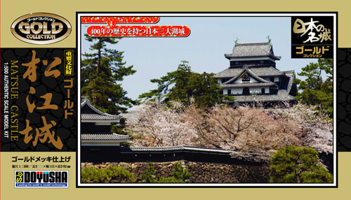 日本の名城プラモデルシリーズ松江城(ゴールドメッキ豪華版)です。屋根部分をゴールドにした豪華版プラモデル。一番最後に認定された日本の5大天守閣の一つ、国宝松江城です。普段の姿とは違った豪華な雰囲気が楽しめるプラモデルです。ご自身のお気に入りのお城を是非製作してみて下さい。