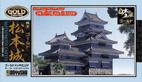 日本の名城プラモデルシリーズ松本城(ゴールドメッキ豪華版)です。屋根部分をゴールドにした豪華版プラモデル。国宝天守でも最も人気のあるお城です。普段の姿とは違った豪華な雰囲気が楽しめるプラモデルです。ご自身のお気に入りのお城を是非製作してみて下さい。